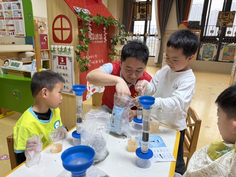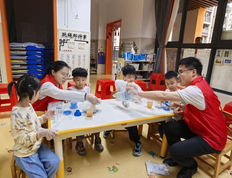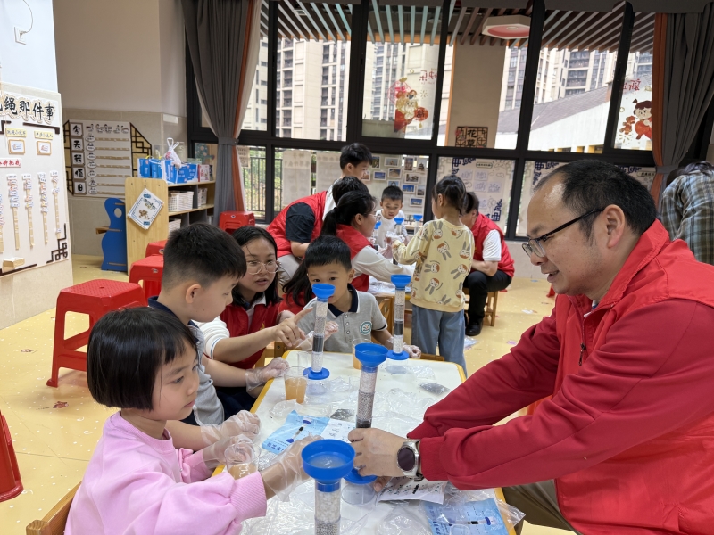 工程团队党支部结合幼儿认知特点精心打磨科普内容,采用“故事引导+动手实验”的沉浸式模式,让抽象的环保知识变得可触可感。活动现场,志愿者以绘本《小水滴的旅行》为引子,用童言童语讲解水资源循环的自然法则;在DIY净水小实验环节,小朋友们在志愿者的分步指导下,用石英砂、活性炭等材料搭建起简易多级净水装置,亲眼见证浑浊的污水经过多层过滤逐渐变得清澈,现场不时响起阵阵惊喜的惊叹。孩子们在亲手操作中直观理解了污水净化的科学逻辑,也对“水环境治理”这项工作留下了具象的初印象。