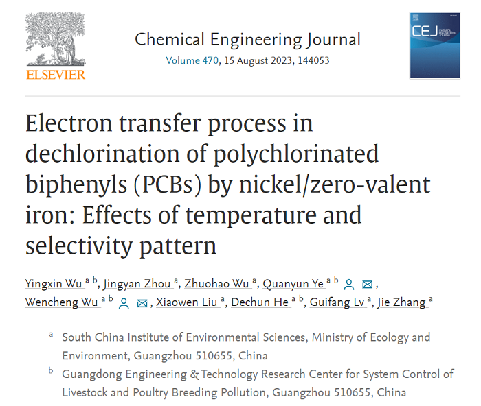 近日,生态环境部华南环境科学研究所(生态环境部生态环境应急研究所)土壤与农村生态环境研究团队吴文成课题组在化工和环境领域权威TOP期刊《Chemical Engineering Journal》上发表了题为“Electron transfer process in dechlorination of polychlorinated biphenyls (PCBs) by nickel/zero-valent iron: Effects of temperature and selectivity pattern”的论文。吴颖欣副研究员为第一作者,吴文成研究员、叶权运助理研究员为共同通讯作者。论文DOI:https://doi.org/10.1016/j.cej.2023.144053