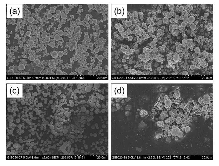 图2: 不同温度条件下Ni/ZVI的SEM结果. (a) 反应前; (b)15℃反应48h; (c)25℃反应48h; (d) 35℃反应48h.