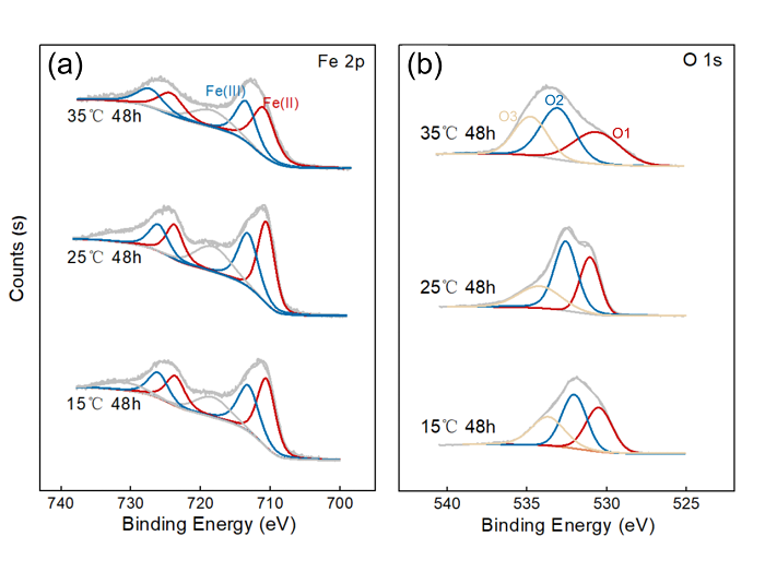图3: 不同温度条件下Ni/ZVI的XPS结果. (a) Fe 2p; (b) O 1s.