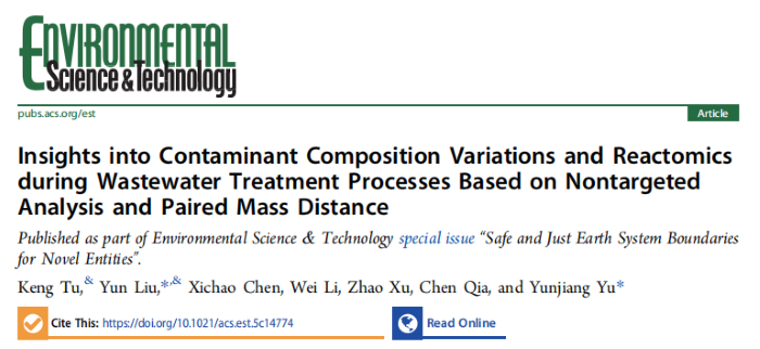 Tu K, Liu Y, Chen XC, Li W, Zhao X, Chen Q, Yu YJ. Insights into Contaminant Composition Variations and Reactomics during Wastewater Treatment Processes Based on Nontargeted Analysis and Paired Mass Distance. Environ. Sci. Technol. 2026, 60(6): 5086–5096. DOI: 10.1021/acs.est.5c14774.