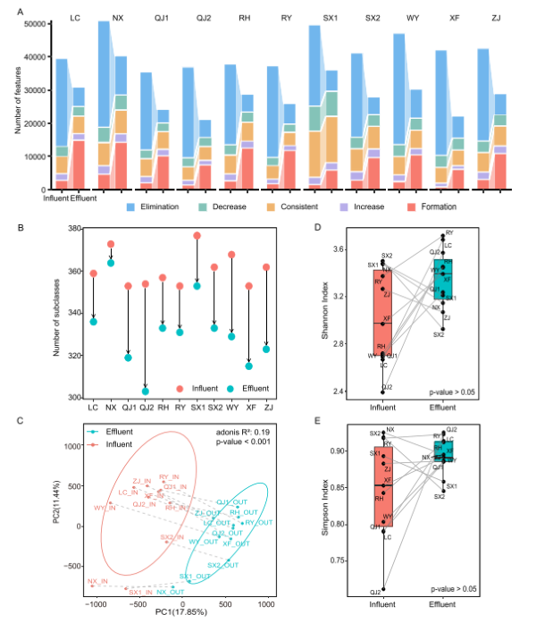 图1:污水处理过程中污染物的特征丰度、结构子类与化学多样性演变规律