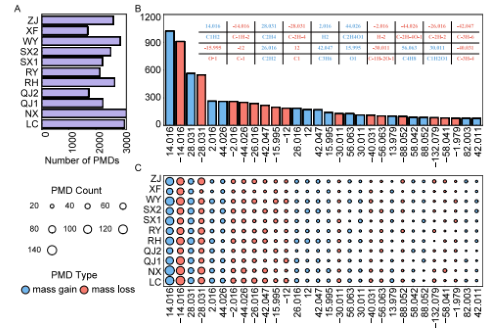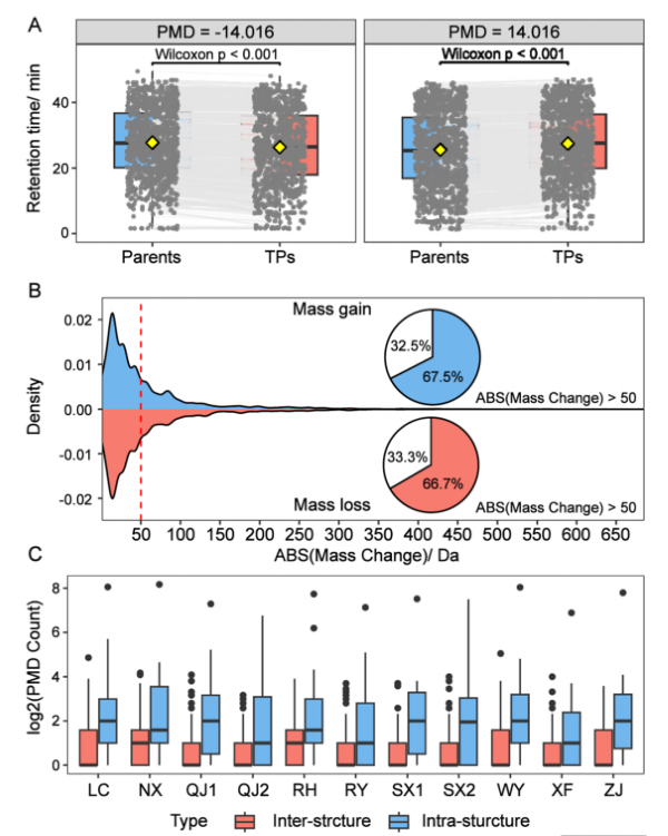 图3:各污水处理厂中成对质量距离(PMDs)的分布及高频生化转化反应保守性特征