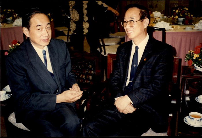 1985年 时任华南所所长强炳寰与国家环保局局长曲格平(右)交谈